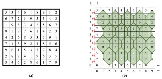Unlike the above methods, several kinds of image steganography based on MMB have been put forward in the last few years. In 2008, Chang et al. [] proposed a novel data hiding scheme using Sudoku. This scheme takes pixel pairs as the coordinates of a Sudoku matrix to specify the value to embed one 9-bit digit into each pixel pair, with an embedding capacity of 1.5 bpp. Figure 1a shows an example matrix of this scheme. Most image data hiding schemes divide the original cover image into non-overlapping small blocks and then use each block idea; the space complexity of the data hiding algorithm can be reduced; the algorithm is more concise, efficient, easy to implement, and convenient for future modification and optimization; and more importantly, it is more suitable for the complicated network environment. In order to design a more efficient data hiding scheme, this paper studies a large number of data hiding schemes and related knowledge, then proposes two image data hiding algorithms based on blocks with higher embedding capacity [,,,]. This scheme can maintain an embedding capacity of 1.5 bpp with less distortion, and Figure 1b is an example matrix of this scheme. In 2016, Liu’s method can maintain good image quality with an average peak signal-to-noise ratio (PSNR) of 41.87dB when the embedding capacity is up to 2.5 bpp [,,]. This scheme improves the embedding capacity and maintains a good visual quality, and, more importantly, has good security (hard to perceive by third parties). It can also use different quality factors to meet the user’s different hidden needs. If the sender has larger number of secret bits to hide, a lower quality factor for the compression image should be selected. If the sender needs a stego-image with a higher visual quality to avoid being suspected by third-party eavesdroppers, a higher quality factor should be a better choice. In 2018, Xie et al. [] put forward a two-layer turtle shell matrix-based data embedding method, which added one layer of matrix with the turtle shell as a cell based on the turtle shell matrix-based data hiding method proposed by Chang et al. [] maintained an embedding capacity up to 2.5 bpp and achieved larger embedding capacity and high image quality with a PSNR of 47.12dB. In recent years, the mini-Sudoku matrix-based data hiding schemes [,,] have also been proposed. In 2019, He et al. [] proposed a mini-Sudoku matrix-based image steganographic scheme which could reach an embedding capacity of 2 bpp and a PSNR of 46.37dB. In 2020, Horng et al. [] proposed a cubic mini-Sudoku matrix-based image steganographic method in which the algorithm uses a cubic magic cube at the plane matrix stage. In the same year, Chen et al. [] put forward a multi-layer mini-Sudoku matrix-based data hiding method, which showed an embedding capacity up to 3 bpp and a PSNR of 40.01 dB.
