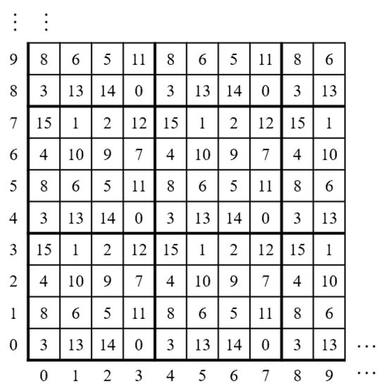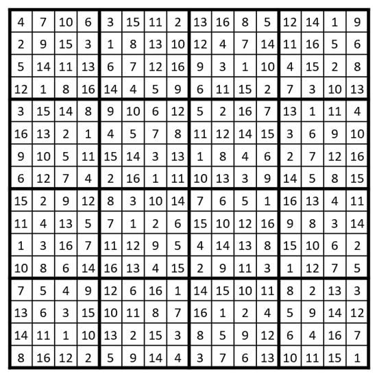 A 16 × 16 Sudoku matrix is a magic matrix developed from a 4 × 4 magic matrix by adding conditions and complexity. Moreover, a Sudoku matrix can generate countless combination patterns. It is not easy to decode and then extract the steganographic content even if the Sudoku matrix-based image steganography is identified. Therefore, the security of such an algorithm is relatively high. Figure 2 is an example of the 16 × 16 Sudoku matrix.