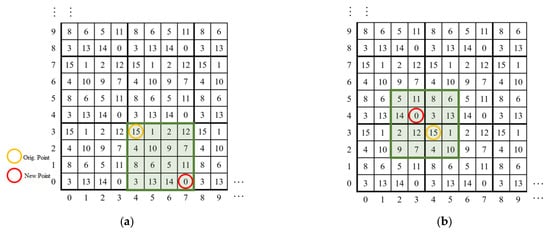 The traversal area is an area determined by the structure and construction constraints of a magic matrix. All values in the area, and how to search the closest satisfactory point, need to be considered in its design. For example, the methods for determining the traversal area in the 4 × 4 magic matrix-based data hiding method are shown in Figure 4a,b. The construction constraints of a 4 × 4 magic matrix are that the column sum, row sum, and diagonal sum are all 30. This magic matrix as the basic magic matrix fills in loops to generate a 256 × 256 matrix. This magic matrix is used to simulate the process of hiding the ciphertext 0 from the pixel pair p(4,3). In Figure 4a, the basic magic matrix serves as the traversal area for data hiding, and a new pixel pair p′(7,0) is got as an outcome. The PSNR, in this case, is 38.59dB. In Figure 4b, the 4 × 4 area where the origin is located on the inside lower right serves as the traversal area for data hiding, and a new pixel pair p′(3,4) is obtained as an outcome. The PSNR, in this case, is 48.13. The determination of the traversal area depends on the image quality.