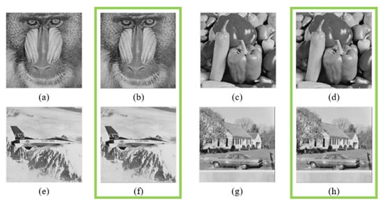 Image contrast according to 4 × 4 magic matrix-based data hiding method, with stego-images displayed in green box; they should be listed as (a) original image of baboon, (b) stego-image of (a), (c) original image of pepper, (d) stego-image of (c), (e) original image of airplane, (f) stego-image of (e), (g) original image of house, and (h) stego-image of (g).