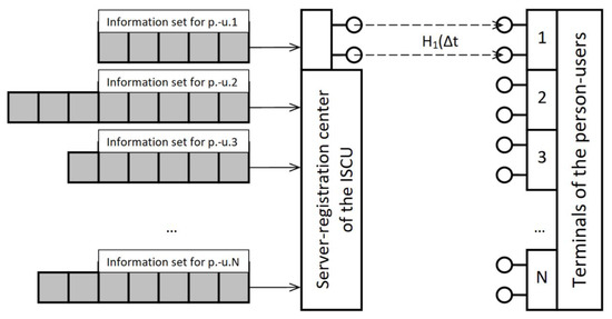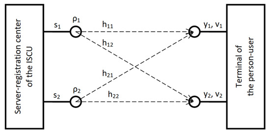 As noted in articles [19,20,21], at the communication level, the information system for critical use is represented by a sets of data servers and terminals of person-users that interact with each other through the registration center server. At the physical level, the person–system interaction sessions are supported by a set of receiving–transmitting devices on the side of the registration center server and a unified set of receiving–transmitting devices on the side of the terminals of each person-user. To receive an information package of a finite size, the person-user initiates a session of the person–system interaction through the personal terminal, during which they address their request to the registration center server, which, having received the requested data from the corresponding data server, sends them to the target terminal, thus ending the active session, which is marked by the release of the involved receiving–transmitting devices. Assuming that the communication channel between the registration center server of ISCU and the terminals of person-users is wireless, we summarize the above by presenting a structural model of the person–system interaction session in Figure 1.
