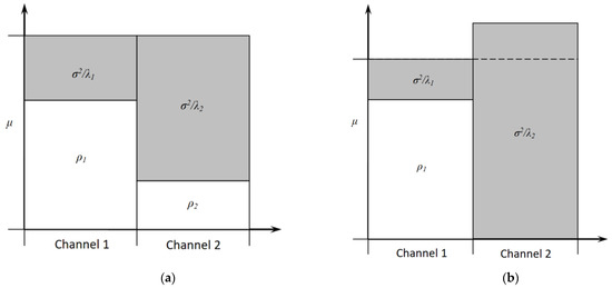 where , are the eigen values of the matrix , is the power of signal transmission via the th route, operation over the value of is revealed as , and is a constant, the value of which is chosen so that the equality is satisfied. To determine the constant , we will use the known water filling principle [24,25], a graphical interpretation of which for the case of a session of person–system interaction with two routes is shown in Figure 2.