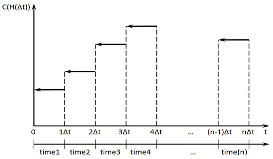 When studying the process of person–system interactions, we will consider time to be a discrete value with the quantization period . We will also assume that all session activation requests from person-users initiated during the current quantum of time will be considered by the registration center server at the beginning of the new quantum of time simultaneously. We will also assume that after activating the person–system interaction session, the terminals of the person-users do not change their spatial location relative to the registration center server, i.e., the route matrix defined for the th person-user does not change until the end of the quantum of time. Finally, we assume that the active session of the person–system interaction can end only after the end of the quantum of time. Thus, for time , the values of the set of controlled parameters are determined immediately after the beginning of the th quantum of time: