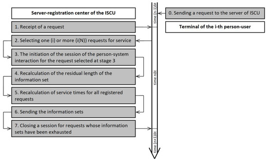 In such a model, the registered request can be selected for service with probability , the value of which is determined only by the number of registered requests in the queue. It should be noted that the active session of the person–system interaction, initiated by the registration center server of ISCU to satisfy the request, cannot be interrupted at each quantum of time, and must end correctly after the transmission of the entire information package (this condition is easier to meet the more quanta of time duration and average time for servicing one request, i.e., transmission of one block of data).