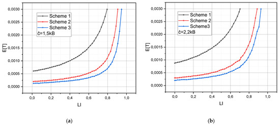 Next, using Equations (13), (20) and (24), we calculated the parameters of the geometric distribution , , for Schemes 1, 2, 3, respectively. The values of , , obtained at the duration of the quantum of time and determined according to Figure 6 for values of Mbps, Mbps, Mbps for Schemes 1, 2, 3, respectively. According to the condition of stationarity, for the calculated parameters of the geometric distribution at the values of the probabilities are defined as . The defined and calculated parameters allowed when substituting in Equation (12) to calculate the dependences of the average time that the request spent on the server registration center of ISCU on the load level of the latter. The sessions of person–system interactions were organized according to Schemes 1–3 and using protocol with un-guaranteed activation of service . In graphical form, these dependencies are presented in Figure 7.