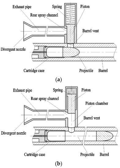The schematic of the gun with side to rear jet controlled by piston motion is shown in Figure 1. To avoid the imbalance of lateral force on the barrel, the recoil reduction device is symmetric about the barrel axis, and just one side is displayed in Figure 1. In the side wall of the barrel, there is a vent which is near the breech and in front of the chamber. Initially, the barrel vent is blocked by the piston under the action of spring force, as shown in Figure 1a. After the projectile reaches the barrel vent, the propellant gas in the barrel flows into the piston cavity and pushes the piston to move upwards. Only when the piston travels a specified distance can the rear spray channel be opened, as shown in Figure 1b. Then the propellant gas flows through the exhaust pipe and finally ejects from the divergent nozzle at high speed, producing a forward thrust to reduce the recoil momentum. When the rear spray channel is opened, the rarefaction wave is generated due to the pressure drop at the barrel vent, and travels towards the projectile base and the breech. The pressure reduces where the rarefaction wave reaches. However, the projectile base pressure does not drop immediately because the projectile has arrived at a position far from the barrel vent. Thus, it is possible to make the rarefaction wave unable to catch the projectile until the muzzle under the reasonable matching of the parameters, such as the barrel vent size and the spring stiffness. The piston will be reset under the action of the spring force after the propulsion process is over, so the continuous firing of the gun is not affected. This gun is called the piston-controlled gun in the following paragraphs.