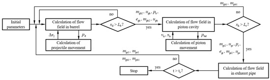 Where xd is the projectile displacement, Lb and Lr are the location of the barrel vent and the rear spray channel, pd is the projectile base pressure, Δx2 is the length of the cell near the projectile base, ts is setting time, mgb2 and mpb2 are the mass flow rate of the gas and solid phase into the piston cavity from the barrel vent per unit volume, mgr1 and mpr1 are the mass flow rate of the gas and solid phase out of the piston cavity from the rear spray channel per unit volume, mgr2 and mpr2 are the mass flow rate of the gas and solid phase into the exhaust pipe from the rear spray channel per unit volume.