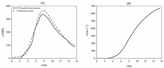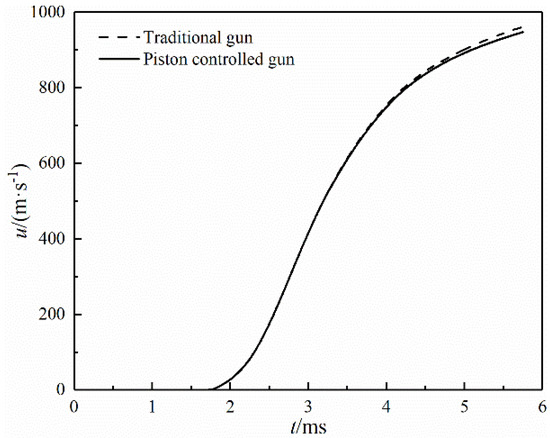 The projectile base pressure of the piston-controlled gun was almost the same as that of the traditional gun, although some propellant gas was ejected from the barrel during the propulsion process. Therefore, the velocity–time curve of the projectile of the two guns was not much different, as shown in Figure 10. Nevertheless, the influence of the barrel vent on the projectile velocity could still be seen. Compared with the traditional gun, the muzzle velocity of the piston-controlled gun reduced from 960.0 to 947.5 m/s, a decrease of 1.30%.