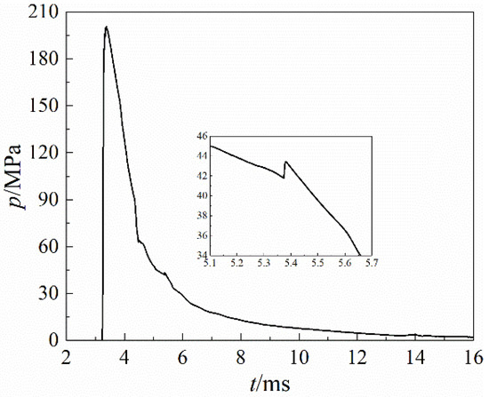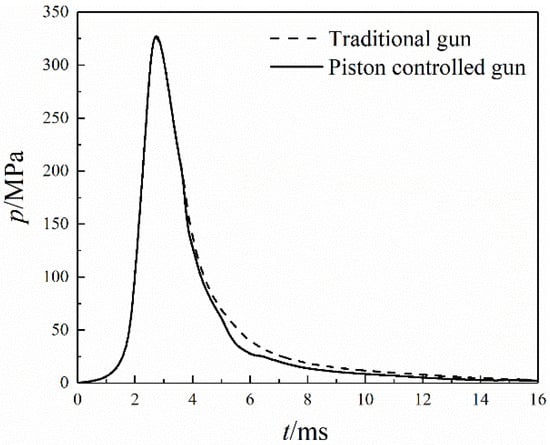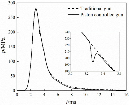 Similarly, the breech pressure of the piston-controlled gun started to reduce at 3.62 ms instead of 5.08 ms, as shown in Figure 8. The projectile reached the barrel vent at 3.23 ms, and then a rarefaction wave traveled towards the breech and arrived at the breech at 3.62 ms. However, the breech pressure of the piston-controlled gun dropped slightly at this time, but dropped significantly at 5.08 ms. The reasons are as follows. The pressure drop at the barrel vent at 3.23 ms was low, so the rarefaction wave intensity was also low. Thus, the pressure drop at the breech at 3.62 ms was small. The rear spray channel was opened at 4.34 ms, so the pressure drop at the barrel vent was higher, and the rarefaction wave intensity was higher. Therefore, the pressure drop at the breech was higher.