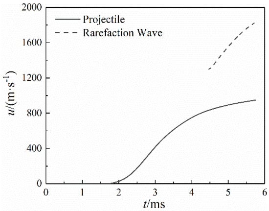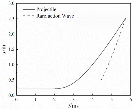 When the rear spray channel was opened, a large amount of propellant gas in the barrel flowed into the piston cavity, resulting in a sudden decrease of pressure at the barrel vent. Then the effect of the pressure drop travelled towards the breech and the projectile base in the form of continuous rarefaction waves. The movement characteristics of the projectile and the rarefaction wave front towards the projectile base are shown in Figure 6 and Figure 7. The rarefaction wave was produced at the barrel vent at 4.46 ms, and then travelled towards the projectile base and the breech. Meanwhile, the projectile was 0.86 m away from the barrel vent. The velocity of the projectile and the rarefaction wave both increased monotonically. However, the velocity of the rarefaction wave was higher than that of the projectile. Therefore, the rarefaction wave caught the projectile at 1.28 ms after the rarefaction wave was produced. In the meantime, the projectile just reached the muzzle exit.