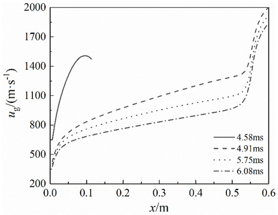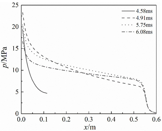Figure 11 and Figure 12 show the pressure and gas velocity distribution along the exhaust pipe axis at four moments after igniting: 0.24 ms after the rear spray channel was opened (4.58 ms after igniting), 0.43 ms after the rear spray channel was fully opened (4.91 ms after igniting), the moment when the projectile exited the muzzle (5.74 ms after igniting), 0.34 ms after the fifth moment (6.08 ms after igniting). Here we define that mark “0” of x-coordinate denotes the rear spray channel, and the nozzle exit is rightward. As can be seen from Figure 11 and Figure 12, a rapid increase of pressure and gas velocity occurred at the entrance of the exhaust pipe at 4.58 ms because the rear spray channel was opened and the propellant gas flowed into the exhaust pipe at high speed. Meanwhile, the propellant gas did not fill the whole pipe. After 4.91 ms, the propellant gas filled the whole pipe and expanded in the pipe, so the propellant gas velocity increased continuously. In the divergent nozzle, the high-pressure propellant gas further expanded and accelerated, thus gaining a greater impulse.
