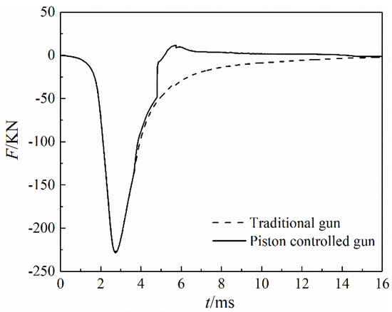 Here we define the force towards the muzzle as the positive. Compared with the recoil of the traditional gun, that of the piston-controlled gun declined slightly at 3.62 ms because the breech pressure reduced, as shown in Figure 8 and Figure 13. At 4.79 ms, the propellant gas was ejected from the nozzle, producing a strong reverse thrust, so the recoil of the piston-controlled gun declined rapidly and became positive. However, the breech pressure peak occurred before the propellant gas was ejected from the barrel, so the recoil peak did not change.