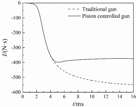 It can be seen from Figure 14 that the recoil momentum of the piston-controlled gun also dropped at 3.62 ms and reached the minimum value of 372.77 N·s at 14.17 ms. From then on, the recoil momentum of the piston-controlled gun began to increase. The reasons are as follows. As the rear spray channel was fully closed at 13.96 ms, the propellant gas in the exhaust pipe was completely ejected out, and then no reverse thrust would be produced. During the propulsion process, the recoil momentum of the traditional gun was 549.72 N·s, while that of the piston-controlled gun was 374.91 N·s, so the recoil reduction efficiency was 31.80%.