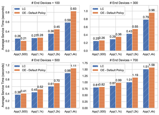 This section will validate how service time changes along with the number of IoT devices under two architectures and three offloading strategies. As observed from Figure 5, when resource requests from IoT tasks are relatively small (e.g., App(0.25,500)), the overall service time is insensitive to the growing number of end devices even under different architectures and strategies. The reason is that no matter where the final destination of offloading is, the current resources in Edge-Cloud nodes are sufficient to handle these light IoT tasks offloaded, thus the offloading procedure does not make significant contributions.