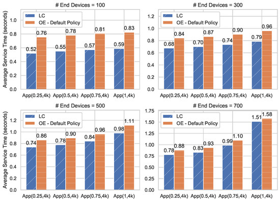 Edge Orchestrator can effectively seek placement for the incoming tasks based on a defined strategy by taking specific characteristics of IoT tasks into account. In comparison, to deal with App(1,4k), the tasks with the largest resource requests, both LC and OE experience a soaring increase of service time along with the incremental number of end devices. Obviously, Edge Orchestrator in the OE scheme needs to consume a slightly longer time for coordinating resources among Edge-Cloud nodes and make placement decisions subsequently. We can observe a similar phenomenon when comparing App(1,500) with App(1,4k) shown in Figure 5.