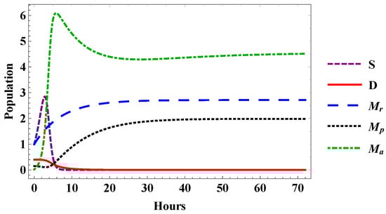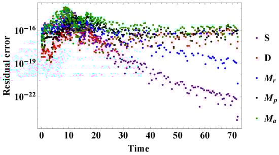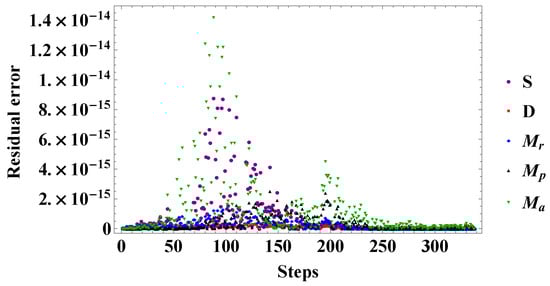 The SDRPA model involves 18 parameters, including five parameters for the initial conditions of each compartment. Herein, the researchers list several parameters which can be assessed using the experimental studies. Furthermore, for solving the system of ordinary differential equations ((1)–(5)), other parameter values were obtained by simulations through the Software MATHEMATICA with the command NDSolve. The purpose was to assess the SCs’ ability to control the functions of immune cells during a stroke. From the simulation of SDRPA model, it can be concluded that there are three parameters that directly affect the behavior of microglia and SCs after transplant, parameter , which represents the rate of amendment of SCs for the function of , parameter , which shows the rate of stimulating and supporting SCs of anti-inflammatory immune cells and, the suppression rate of SCs as a result of damage by pro-inflammatory microglia denoted by the parameter , and the simulation results showed that the effectiveness of stem cell transplantation to modulate pro-inflammation microglia function where the highest rate of SCs will switch the balance from a pro-inflammatory to anti-inflammatory response of microglia as follows: the rate involving SCs was simulated by and . Furthermore, it was obvious that the modulation of microglia responses occurred if the following conditions were satisfied: The rate of stem cell amendment for the function of ; and the suppression rate of SCs by , . Table 1 displays the reference series of values of the parameters. From Figure 1, we can observe various behaviors depending on the transplant process. In addition, damage continually decreased, while pro-inflammation microglia had a little increase, asides from shifting to a steep curve after approximately 20 h. Furthermore, that anti-inflammation microglia had a high level after stroke onset and transplantation SCs, aside from shifting to a steep and a stable curve at approximately after 20 h to the end of simulation of the recovery stage. It can be seen that after SCs transplanted in the brain the anti-inflammation microglia had a higher level than the pro-inflammation microglia comparing with numerical results evaluating microglia effect on the brain dynamics without SCs transplantation during 72 h of strok as presented in [4]. Additionally, for the concentration of transplanted SCs, there was initial growth and subsequently a reduction over time due to the effects of the treatment on the elimination rate of pro-inflammation microglia. The system was solved numerically, and time concatenation of the solutions were plotted on the system ((1)–(5)) for the parameters to obtain the dynamics of the system. For this, the fourth-order Runge–Kutta method (RK4) was used in all simulations to obtain extra stable and approximate solutions. The time 72 h was chosen for as the step size for carrying out the simulations of the model [40,41]. Figure 2 and Figure 3 depict the precision of the suggested numerical method presented through the residual error.