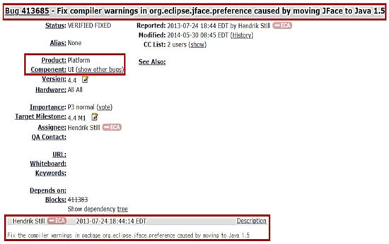 In this study, bug reports and source code information are used for bug localization. A bug report is typically freely available from software developers and may include scenarios and dump files for bugs. For example, an Eclipse bug report (#413685) is shown in Figure 1 [19].