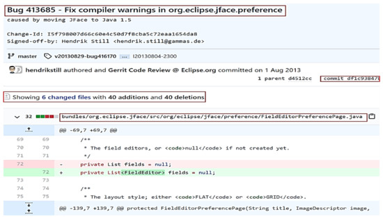 The program source code is composed of various text keywords, and preprocessing is performed to extract features from the source code. The preprocessing step includes tokenization of words, lemmatization of words, prevention of keyword removal, and application of CamelCase [20]. When a source code is preprocessed, various keywords are extracted; an example is shown for the sample source code (PreferenceDialog.java), for the Eclipse platform UI. This preprocessing step can yield various methods, listeners, classes (e.g., “setMessage”, “jface”, “setMinimumPageSize”, and “preference”). Using the terms of the bug report in Figure 1, we find a similar source code by matching the keywords “org”, “jface”, “preference”, “eclipse”, “warning”, and “cause”. Using the commit information in the bug report, the source code is corrected; the corrected source code files are shown in Figure 2 [21].