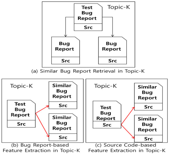 Overview of the feature extraction process. (a) refers to the step of extracting similar bug reports from Topic-K, (b) refers to the step of extracting features from Topic-K’s bug report, and (c) refers to the step of extracting features from Topic-K’s source code.