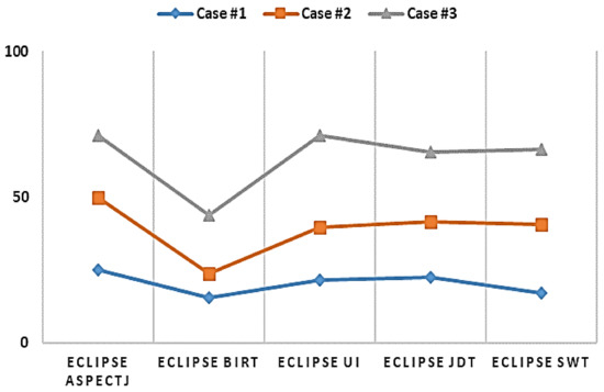In Figure 7, the X-axis refers to open-source projects, while the Y-axis refers to the average F-measure. In Case 1, features are extracted from a given bug report for the source code of a similar bug report. In Case 2, features are extracted from a given source code for the source code of a similar bug report. In Case 3, features are extracted using both a given bug report and source code, for the source code of a similar bug report. For the source code of a similar bug report, feature extraction from a given bug report and source code shows good performance.
