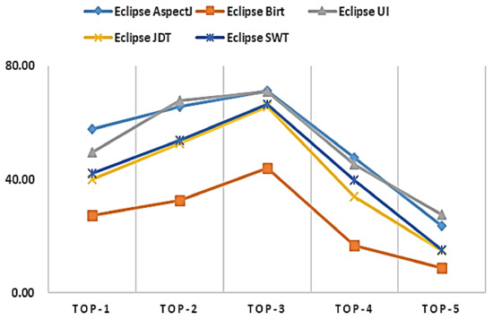 In Figure 6, the X-axis corresponds to the Top-K variable, while the Y-axis shows the corresponding average F-measure. For example, K = 10 means that there is a correct answer among the top 10 recommended buggy source code files. Clearly, performance increases as the number of recommended source codes increases. Overall, Top-15 shows good performance, with an average of 81.7% over all projects.