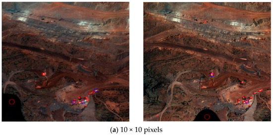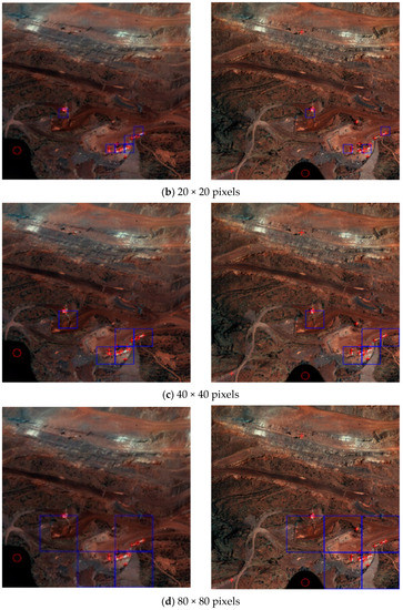 The size of the feature point density node is related to the algorithm’s accuracy. The smaller the density node, the more accurate the matching area obtained, and the larger the density node, the rougher the matching area obtained. In actual image processing, too-large or too-small density nodes are not ideal. The appropriate size of the density node was determined according to the size of the Harris operator feature point detection window. When the detection window was a 7 × 7 pixel matrix, multiple experiments were conducted by selecting 10, 20, 40, and 80 pixels as the side length of the density node. Figure 3 shows that when the density node was divided into 10 × 10 pixels or 20 × 20 pixels, the number of feature points in a single density node was too scarce. When the density node was divided into 80 × 80 pixels, the area with low feature point density would also be regarded as a high-density area. Through the comparison of experimental results, selecting 40 × 40 pixels as the density node division standard best reflected the distribution of feature points.