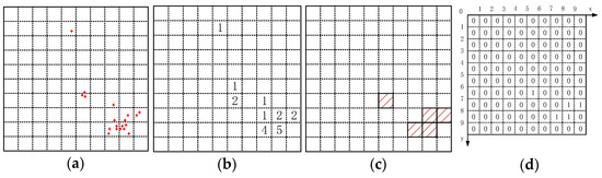 Traverse all the feature point density nodes on the image to count the number of feature points, n, in each density node and set a threshold, t. When n ≥ t, this density node is marked as a high-density node. Otherwise, it was marked as a low-density node. Using t = 1 as an example to mark the high-density nodes, Figure 4a,b can be obtained. The squares represented by diagonal lines in Figure 4c were high-density nodes. For the subsequent algorithm calculation, the high-density node was represented by 1 and the low-density node was represented by 0. The coordinate system as shown in Figure 4d was established with the upper-left corner of the image as the origin of the coordinate system, with the horizontal and vertical axis as the x-axis and y-axis, respectively.