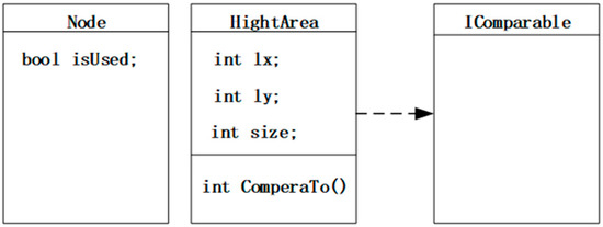 The appropriate data structures should be determined in advance to store the high-density node and high-density area for the recursive diffusion algorithm development. The data structure of the high-density node was represented by a data class called “Node”, in which only a bool variable named “isUsed” was needed to mark whether the node had been used. The high-density area was composed of multiple connected high-density nodes. A data class called “HightArea”, which contained three integer variables and a comparator, was used to represent the data structure of the high-density area. The three integer variables were represented by 1x, 1y, and size. 1x and 1y are used to record the x-axis value and the y-axis value in the upper left corner of the high-density area, respectively. The integer variable size was used to record the number of high-density nodes contained in the high-density area. Additionally, a comparator was needed to compare the size of the high-density areas, which was sorted by the value of the integer variable size from largest to smallest. The algorithm data structures are shown in Figure 5.