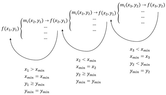 To facilitate the subsequent feature points matching of the high-density area, the coordinates of the upper left corner of the area, namely the smallest x-value component and the smallest y-value component, were selected to represent the distribution position of the area. Taking a branch of the entire recursive diffusion algorithm as an example, the high-density area extraction process is shown in Figure 7. From to is a recursive stacking process. When the function is called for the first time, its sub-process in a certain direction looks for the high-density node that can be diffused. This new high-density node will serve as the diffusion center of the next recursion, and its distribution position will be passed into as an input parameter for a new recursive call. When the recursion proceeds to , no suitable diffusible high-density node can be found anymore, and then the recursion end condition is triggered. In accordance with the order of the arc arrows, the sub-process takes the return value and compares it with step-by-step to update the position coordinates of the high-density area.