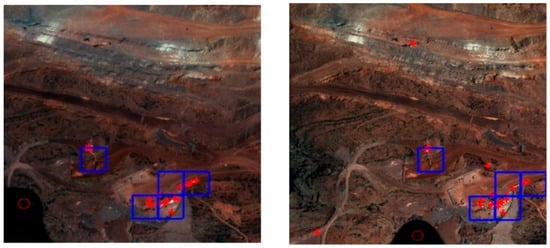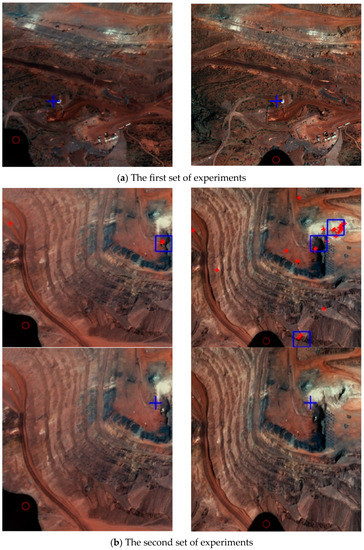 Three sets of representative experimental results are shown in Figure 8, where the red crosshairs represent the feature points of the image, the blue boxes represent the extracted high-density areas, and the blue crosshairs are the matching reference points. It can be found that the recursive diffusion algorithm can deal with the problem of image light changes well, especially in the third set of experiments. The brightness difference in this experiment is obvious, which leads to the different extraction results of high-density areas. However, due to the increase of the correlation analysis of high-density areas, a good matching result is obtained in the end.