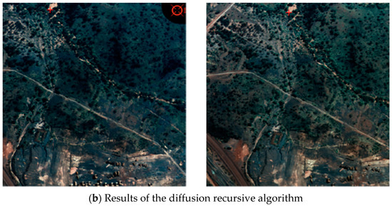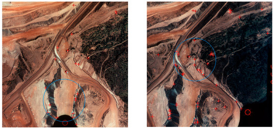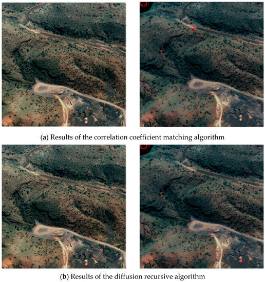 A total of 18 sets of experimental images were selected, and the correlation coefficient method, the mean shift algorithm, and the diffusion recursive algorithm were used respectively to match the feature points of these experimental images. The matching accuracy and timing performance of the three different methods were compared and analyzed. The results are shown in Table 1. Among the 18 sets of experimental images, the number of successful matches using the correlation coefficient method was four sets, and the successful matching rate was only 22.2%. The number of successful matches using the mean shift algorithm was 15 sets, and the successful matching rate was 83.3%. The number of successful matches using the diffusion recursive algorithm was 17 sets, and the successful matching rate was 94.4%. The time-consumption of the correlation coefficient method, the mean shift algorithm, and the diffusion recursive algorithm are 7434 ms, 12,587 ms, and 16,648 ms, respectively, with the Intel Core i7-4720HQ processor. Compared with the other two methods, the diffusion recursive algorithm has no advantage in timing performance. However, when there are high requirements for image matching accuracy, the diffusion recursive algorithm can obtain satisfactory matching results.