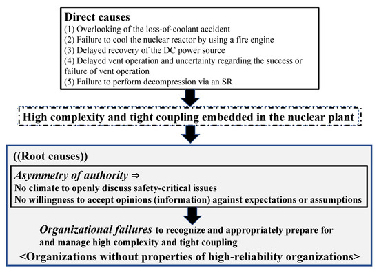 This study showed that high complexity (unpredictability and invisibility) and tight coupling (lower slack and amplification of consequences) underlay the identified direct causes. We conclude that fostering high-reliability organizations without asymmetry of authority that can learn appropriately from failures and predict interactions among components might be an effective countermeasure for future disasters in complex and large-scale systems.
