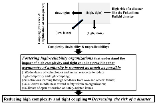Effective measures to prevent serious disasters from occurring are (1) recognize the impact of high complexity and tight coupling and the human vulnerability to cognitive biases, such as confirmation bias, particularly during emergencies, (2) remove asymmetry of authority and promote open discussion on safety issues within an organization and between organizations, and (3) lessen the complexity and loosen the coupling of plants or systems in preparation for future disasters. If sufficient time is taken to enhance the ability to forecast the unpredictable interactions among components in a system with high complexity and tight coupling, to build a plant with reduced complexity (increasing visibility), to loosen coupling (adding slack), and to cultivate high-reliability organizations, disasters can be prepared for, responded to, and mitigated. If high complexity and tight coupling embedded in a system are not addressed deliberately, efforts to address an emergency will presumably interact in unexpected ways and undermine all safety countermeasures, as occurred at the Fukushima Daiichi plant. This issue of preventing a major disaster could be effectively addressed through creating high-reliability organizations [11,12,27] without asymmetry of authority.