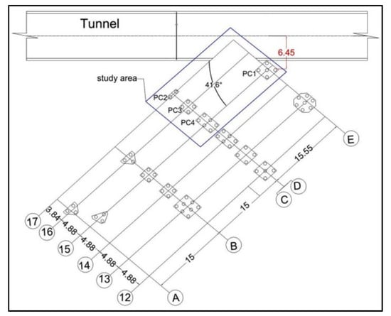 Garage El-Attaba building is 77.04 m in length and 45.55 m in width. It is founded nearby the Greater Cairo Metro-Line 3-phase-1, built with eight stories as shown in Figure 2. This building is about 6.45 m from the center of the tunnel and making an angle of about 42° from the tunnel as shown in Figure 3. This building was supported by 245 non-displacement concrete piles arranged in the pile caps group. The pile dimensions are 0.6 m in diameter and 20 m in length and passes through layered soil. The design allowable load capacity for the pile is 1200 kN [34]. Fundamental to note that only the four piles caps (PC1, PC2, PC3, and PC4) that are the nearest to the tunnel are assigned in this study. Figure 4 shows the pile caps details and the pile cap and pile tip location to tunnel axis.