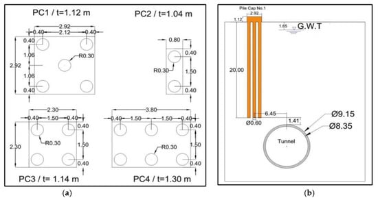 (a) The pile caps details and (b) pile cap and pile tip location to tunnel axis. Units in (m) [34].