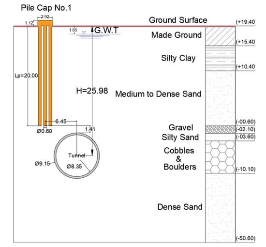 On the other hand, a linear elastic model was used to simulate the piles, pile caps, tunnel lining, and shield machine. This model requires the input of two main parameters, i.e., Young’s modulus and Poisson’s ratio (υ) to describe the stress–strain relationship. Structural properties adopted in the numerical analysis are taken as given in Table 2.