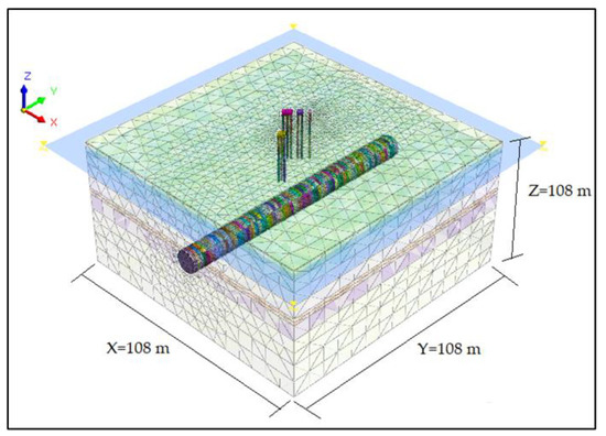 According to the overview of the Greater Cairo Metro Line 3-phase-1 project, there is the Garage El-Attaba building near the construction line. A three-dimensional model is established to study the effect of excavation and tunnel construction of Cairo Metro on the foundations of adjacent Garage El-Attaba building using Midas GTS-NX finite element package. Considering the influence of boundary effects on the accuracy of the numerical results, the area with the most risk of construction was chosen to establish a 3D finite element model to investigate the influence of tunnel construction on 17 adjacent pile groups. In this study, a perspective view of the numerical model is shown in Figure 6. The mesh applied in this model consisted of 51,838 nodes and 300,647 elements. The mesh size is extended in 108 m (length), 108 m (width), and 55 m (depth) in X, Y, and Z directions, respectively, as shown in Figure 6. These dimensions were sufficiently large to minimize boundary effects in the numerical modeling because the larger increase in mesh size did not lead to any change in the analysis results. The ground soil, piles, pile caps, and tunnel lining were simulated using tetrahedron elements. The shield was simulated as a plate and the interface element is not prescribed between the pile and the soil.