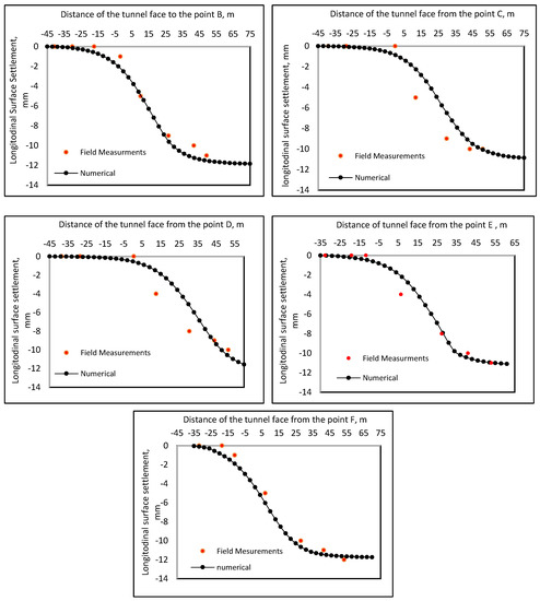 There are five field measurements (SSP. B, SSP. C, SSP. D, SSP. E, and SSP. F) of longitudinal surface settlement that had been monitored which were located near the Garage El-Attaba building as shown in Figure 2. To ensure the validity of the numerical model results, a comparison has been conducted between the field measurements of these points with numerical results as shown in the following Figure 7, and the comparison has indicated a good agreement between the numerical and the measured values.