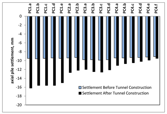 In order to study the behavior of piles caps due to tunneling construction, the axial settlement of 17 piles that connect with four caps was measured before and after tunnel construction as shown in Figure 8. As expected, due to the stress release caused by the tunnel construction, the pile settlement becomes larger than before tunneling. In addition, the results indicate that the nearest pile cap to the tunnel (PC1) was affected by the tunnel progress and the larger settlement occurring on it by about 60% to 70%. After that, the piles settlements are roughly independent of their locations relative to the tunnel route. Therefore, the following sections have concerned with the pile (PC1) only.