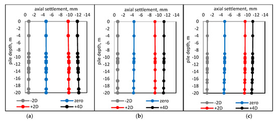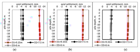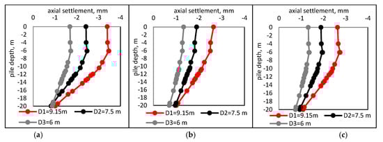 On the other hand, Figure 16 and Figure 17 illustrate the axial settlement of the Near, Middle, and Rear piles for the deep and shallow tunnel, respectively, at various Dtun (9.15, 7.5, and 6) m with constant distance Xpile of 6.45 m. For both cases, it can be seen that the axial settlement of the Near, Middle, and Rear piles is almost higher when Dtun = 9.15 m and decreases with the decreases in the tunnel diameter. This result well agrees with those conducted by [52]. In addition, the axial settlement of the pile occurred uniformly along its length owing to the high stiffness of the pile in the case of the deep tunnel while nonuniform in the case of the shallow tunnel.