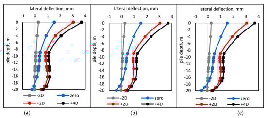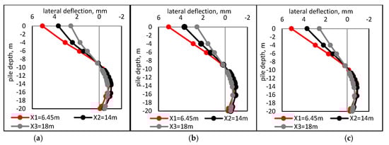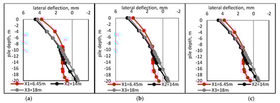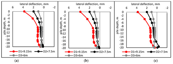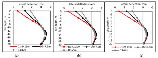 Figure 18 and Figure 19 present the comparison of the lateral deflection behavior of the Near, Middle, and Rear piles for the deep and shallow tunnel at various Xpile (6.45, 14, and 18) m and constant tunnel diameter Dtun of 9.15 m. As it can be seen, the lateral deflection at the pile head is higher than the pile tip, owing to the upper part of the tunnel which has a larger volume of over-cut than the lower part where the restraining effect happened [44]. In addition, an increase in the distance between the tunnel and the pile does not further affect the maximum values of lateral deflection in contrast to the tunnel depth [52].