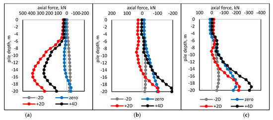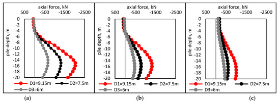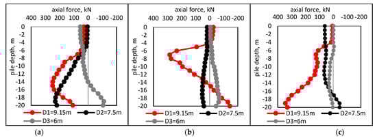 On the other hand, Figure 24 and Figure 25 illustrate the axial force behavior for Near, Middle, and Rear piles located at a specific distance of about 6.45 m from the deep and shallow tunnel with various Dtun (9.15, 7.5, and 6) m. Again, the axial force increases as the tunnel diameter increases. Moreover, the axial force increases by about 75% and 90% in the deep and shallow tunnel, respectively, with D = 9.15 m. This is due to the increase in ground movement around the tunnel construction. As in the case of the shallow tunnel, the axial force at the Near pile is significantly more affected. However, it can be concluded that higher-diameter tunnels induce a higher axial force on the piles. The axial force at the Near pile is larger than that of the middle and Rear pile for the deep and shallow tunnel. In general, additional axial forces can be induced in a pile due to tunnel construction, based on the location of piles relative to the tunnel. These results are similar to those obtained by [44,52,53].