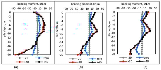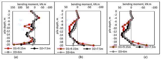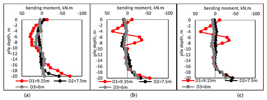 On the other hand, Figure 28 and Figure 29 show the bending moment profiles at various Dtun (9.15, 7.5, and 6) m and a constant Xpile of 6.45 m for the deep and shallow tunnel, respectively. It can be seen that an increase in the diameter of the tunnel causes an increase in bending moment [52]. Moreover, the maximum bending moment occurs at the bottom partition of the piles. Again, the bending moment at the Near pile is larger than that of the Middle and Rear pile for the deep and shallow tunnel. Generally, very little change in the maximum bending moment can be noted for both cases.
