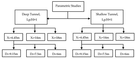 A series of parametric studies are investigated by varying the tunnel-pile distance (Xpile), the diameter of the tunnel (Dtun) at different tunnel axis (H). The whole study is categorized into two cases; deep tunnel where the tunnel axis is located below the tip, (Lp/H < 1) and shallow tunnel where the tunnel axis is located above the tip (Lp/H > 1). Figure 13 shows the flowchart of the parametric studies.