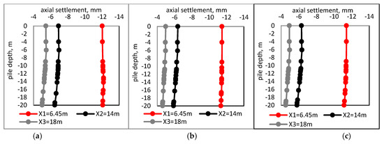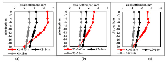 Axial settlement at a depth of (a) Near, (b) Middle, and (c) Rear piles with different Xpile for the deep tunnel (H = 26 m).