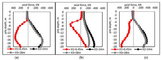 Axial force at depth of (a) Near, (b) Middle, and (c) Rear piles with different Xpile for deep tunnel (H = 26 m).