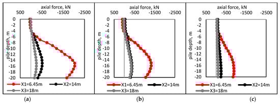 The developing axial force distribution along with the Near, Middle, and Rear piles at various pile positions Xpile (6.45, 14, and 18) m relative to the deep and shallow tunnels with a constant diameter Dtun of 9.15 m are demonstrated in Figure 22 and Figure 23. For both cases, the axial force at the upper part of the pile does not affect by the tunnel excavation while the effect increases more significantly at the middle and lower partition of the pile. In addition, an increase in the distance between the pile and the tunnel does not cause much variation in the axial force. Furthermore, there is a significant effect in the amount of axial force at the Near pile while a small effect at the Middle and Rear piles in the case of the shallow tunnel. However, the induced maximum axial force at the Near pile is larger than that of the Middle and Rear pile for the deep and shallow tunnel. This result well agrees with the findings of [52,53].