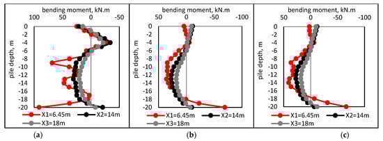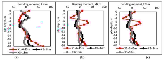 Bending moment at a depth of (a) Near, (b) Middle, and (c) Rear piles with different Xpile for the shallow tunnel (H = 14 m).