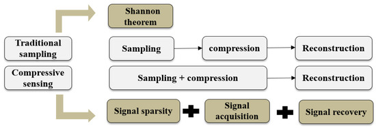 Compressive sensing is a powerful technique, which combines both, sampling and compression technologies in a one-step process. It is firstly presented as innovative method to sample signals with a lower frequency than Shannon’s one, to accelerate the channels sensing, minimize the complexity of the computations and decrease the hardware cost [42,43]. The reduction of hardware cost occurs by using different schemes to replace the classical ADC used at the Nyquist rate. These schemes decrease the number of samples required for high-dimensional-signal acquisition while consuming less energy. For examples, the authors in Reference [44] proposed a new scheme of compressive sensing technique to increase the battery lifetime of the sensor nodes during transmission. In Reference [45], the authors proposed a novel design for deterministic compressive sensing recovery that consumes less power and hardware resources (less DSP cores and RAM). In References [46,47], the authors studied one-bit compressive sensing as a suitable solution to decrease the hardware cost by considering only the sign of every measurement. Figure 1 illustrates the three major processes involved in the compressive sensing concept: signal sparsity, signal acquisition, and signal recovery.