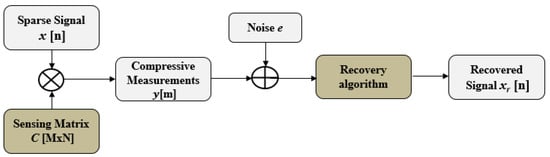 Let x ∈ RN be a K-sparse signal of length n in a specific dictionary D; thus, x can be approximated by sparse vector, q, which contains, at most, K non-zeros, and (N − k) entries are zero, i.e., x = Dq and ∥q∥0 ≤ K. Then, the compression process is represented as a result of the multiplication operation of a sensing matrix C and the sparse signal x. It can be described mathematically, as follows: